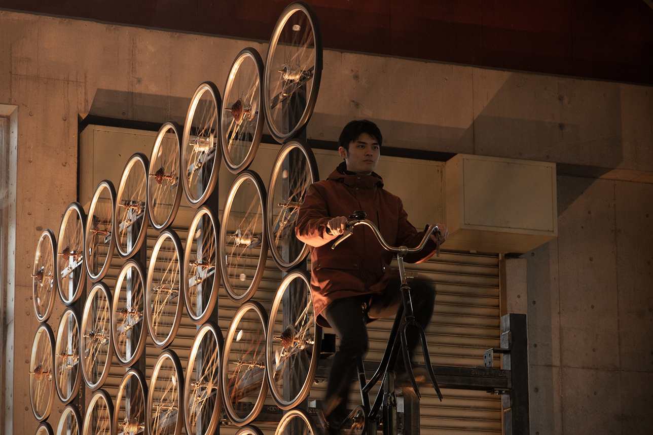 訪れる人々が作品を体験しそれらを動かす。車輪が古くなったら、地域でまた集めて、取り替えていく。このような無限のサイクルがコミュニティの中で生まれることを想像しながら制作しました。自転車の止まってしまった時間や記憶が人間の漕ぐ動きによって再び命を取りもどします。