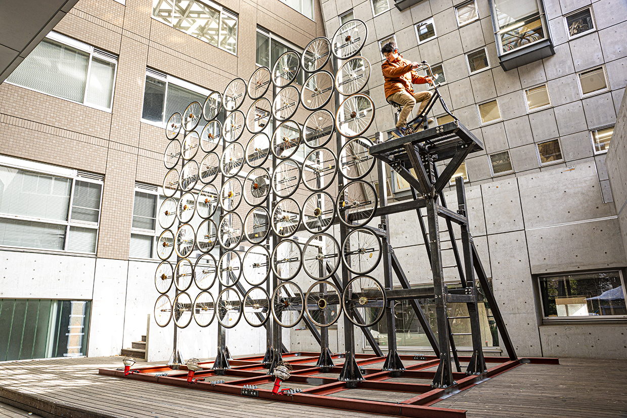 《無限車輪》は多数の自転車の車輪を連結させ、人間が漕ぐことによって全ての車輪を回転させることができる装置です。