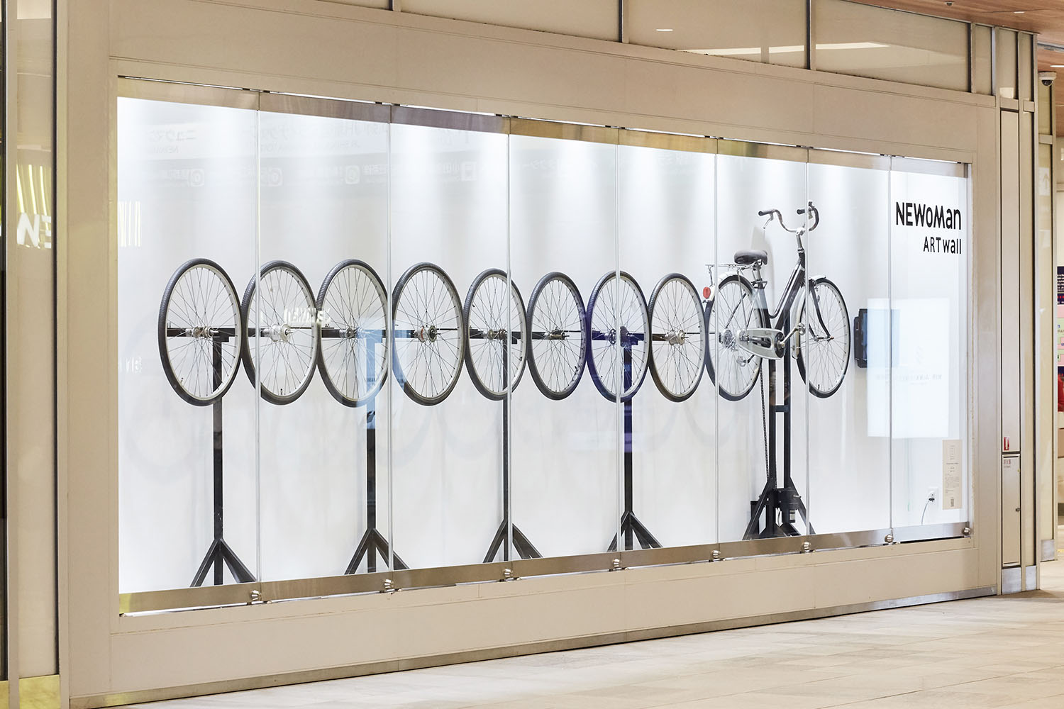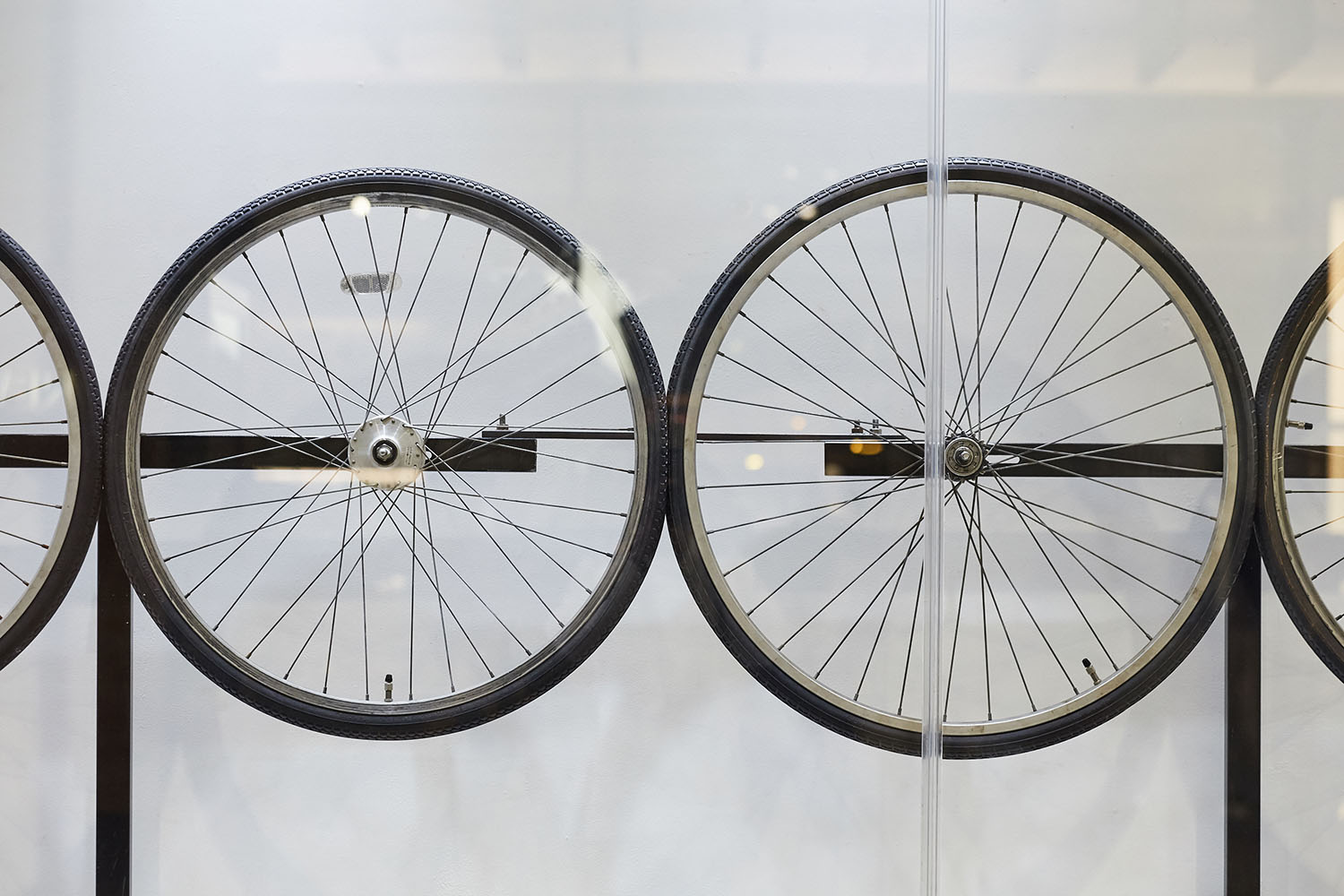 《自連車》はモーターで動く先頭の自転車に連動して8つのタイヤが回転する作品です。