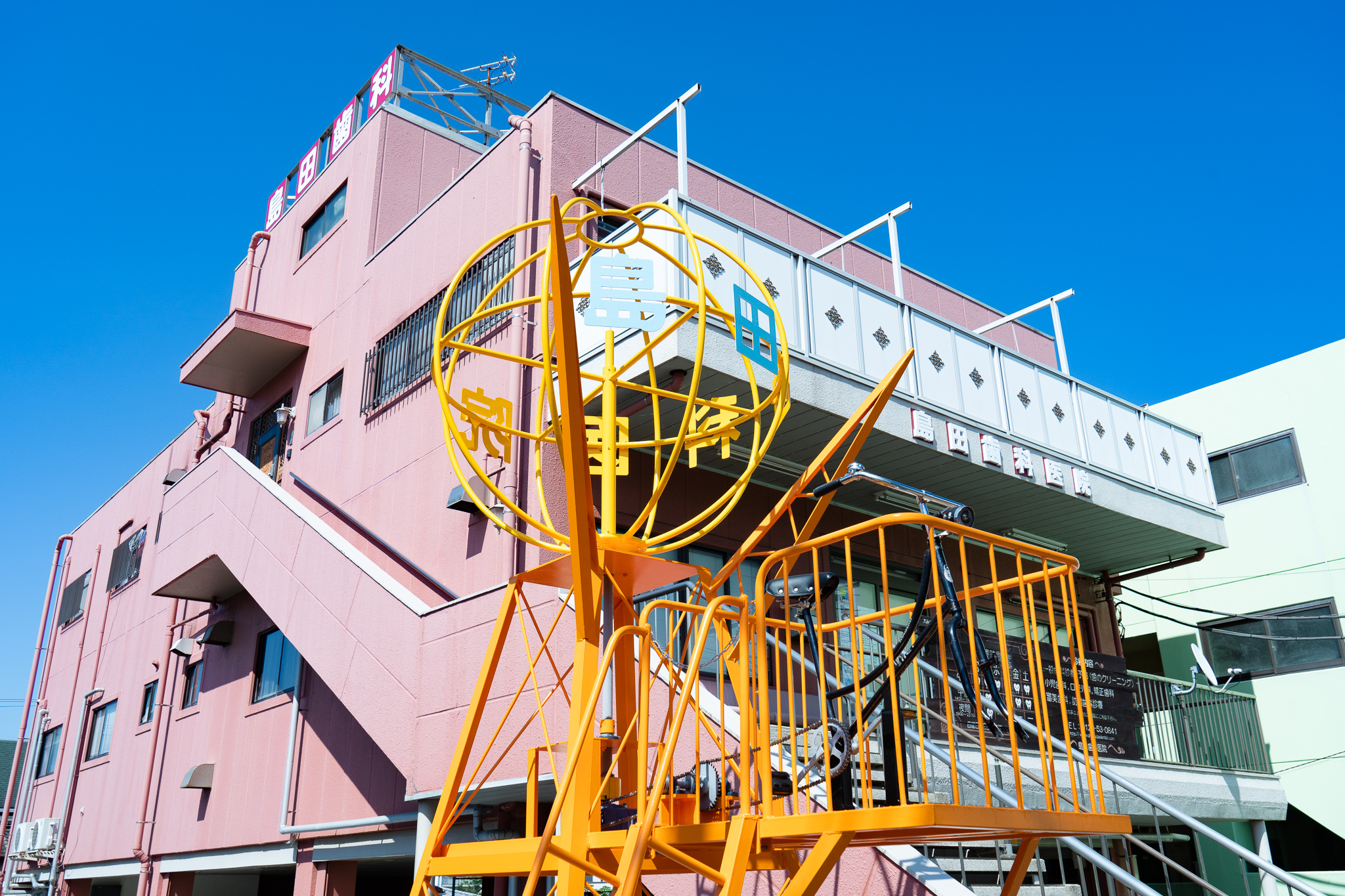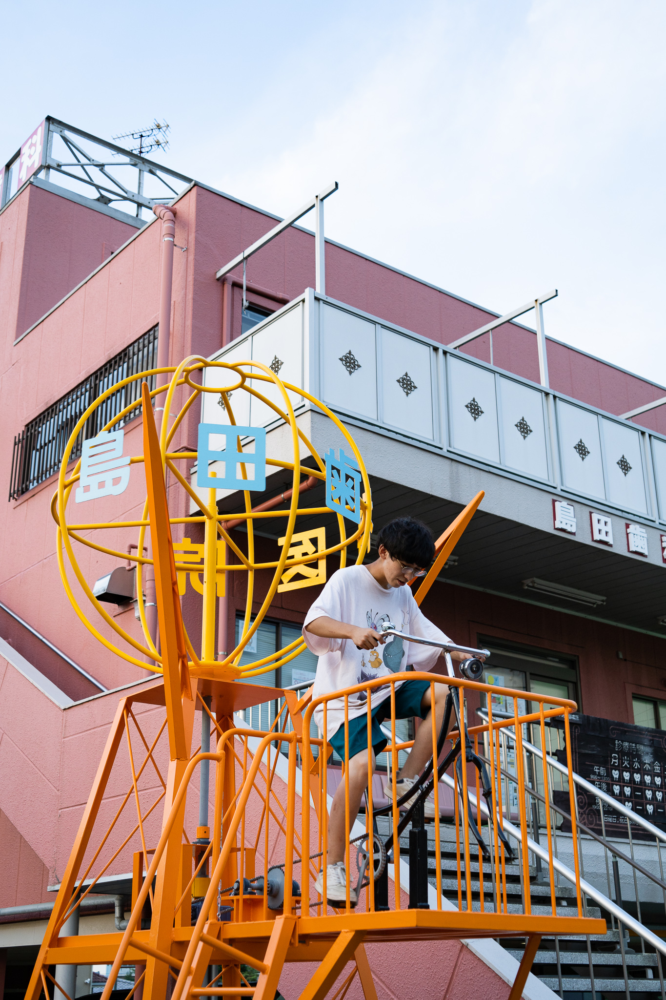 本作品は看板であり、アート作品であり、体験する遊具である、という三つの機能を持っています。観客はこの作品に乗って、島田歯科医院と書かれたグローブジャングルを回すことができます。